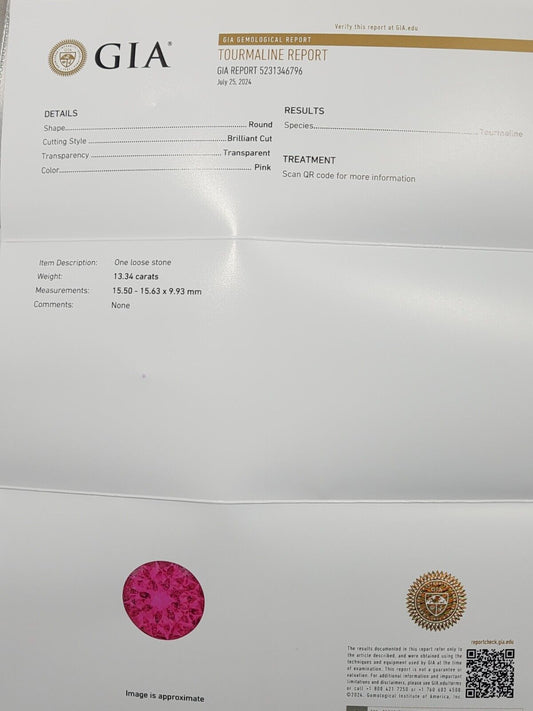 13.34 Vivid Pink Round Tourmaline, GIA Report, Amazing Stone
