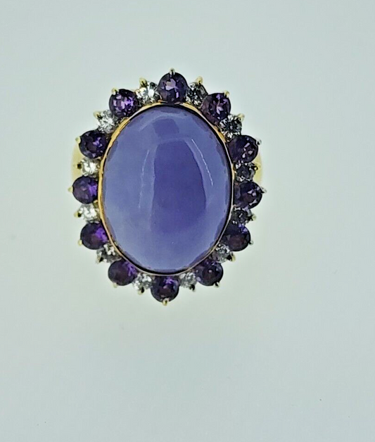 14k Yellow Gold Ring with Purple Jadeite Jade, Diamonds and Amethyst (GIA Report
